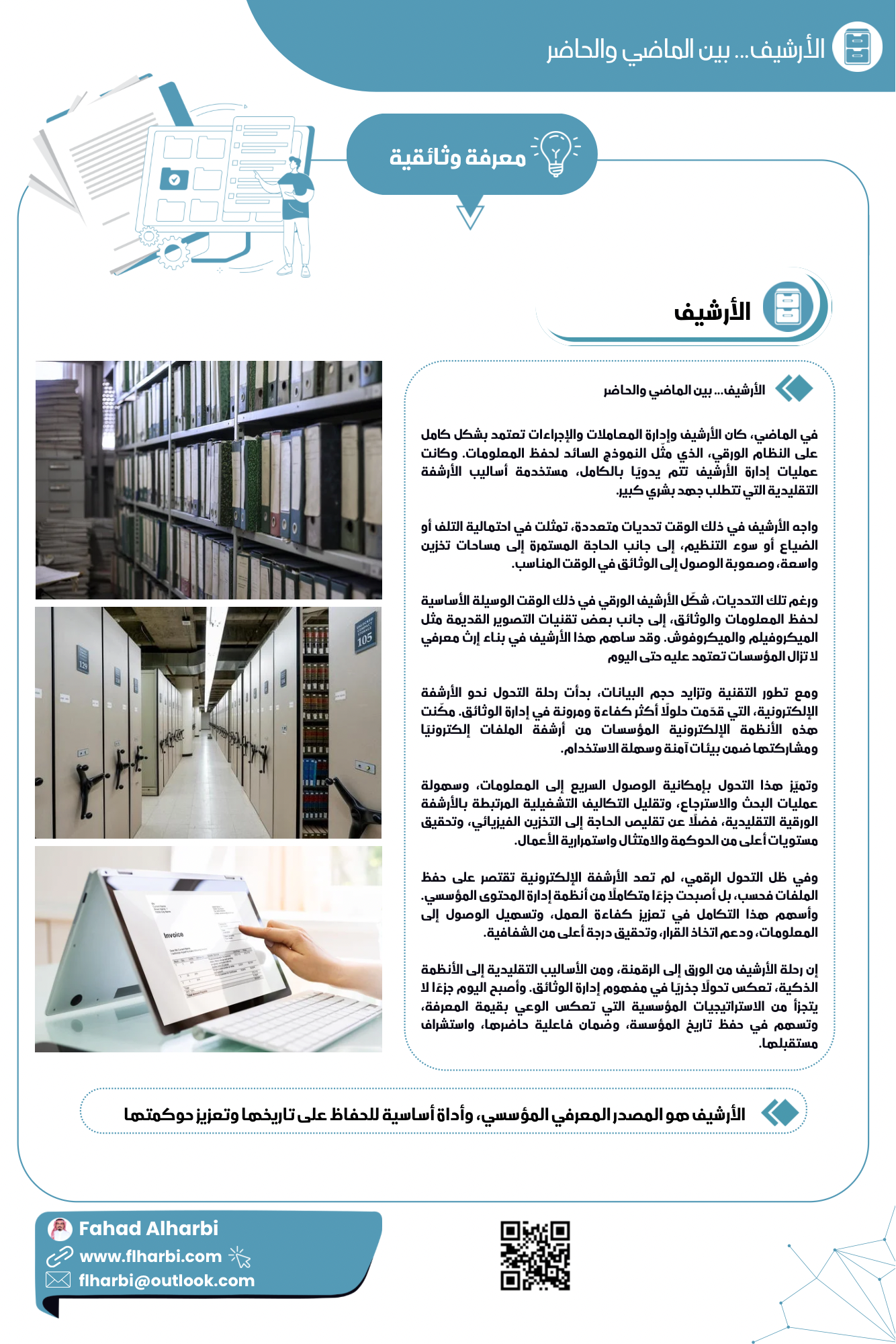 إن رحلة الأرشيف من الورق إلى الرقمنة، ومن الأساليب التقليدية إلى الأنظمة الذكية، تعكس تحولًا جذريًا في مفهوم إدارة الوثائق. وأصبح اليوم جزءًا لا يتجزأ من الاستراتيجيات المؤسسية التي تعكس الوعي بقيمة المعرفة، وتسهم في حفظ تاريخ المؤسسة، وضمان فاعلية حاضرها، واستشراف مستقبلها.