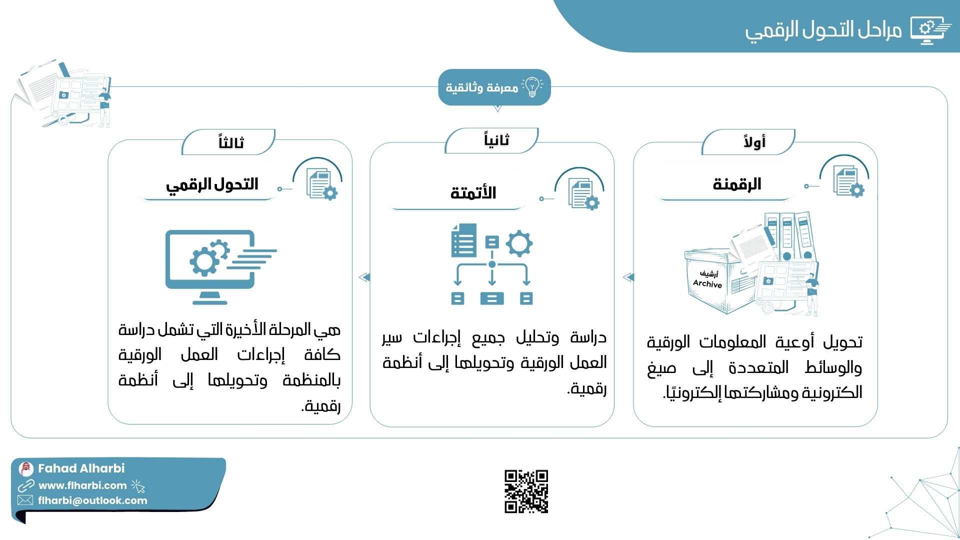 الأتمتة : دراسة وتحليل جميع إجراءات سير العمل الورقية وتحويلها إلى أنظمة رقمية.
