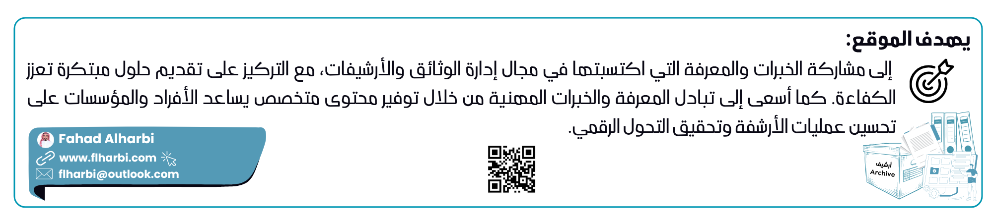 يهدف الموقع إلى مشاركة الخبرات والمعرفة التي اكتسبتها في مجال إدارة الوثائق والأرشيفات، مع التركيز على تقديم حلول مبتكرة تعزز الكفاءة. كما أسعى إلى تبادل المعرفة والخبرات المهنية من خلال توفير محتوى متخصص يساعد الأفراد والمؤسسات على تحسين عمليات الأرشفة وتحقيق التحول الرقمي.